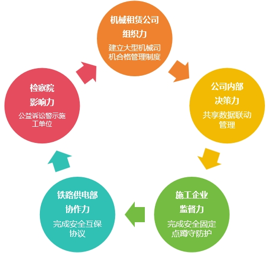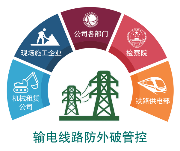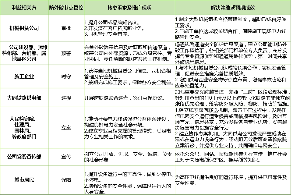 針對利益相關(guān)方的“五力”優(yōu)勢(組織力、決策力、監(jiān)督力、協(xié)作力、影響力),明確核心訴求和責(zé)任邊界,建立大型機(jī)械司機(jī)合格管理、臨時施工備案信息共享、施工固定點蹲守防護(hù)、鐵路安全互保協(xié)議、檢察院公益訴訟等多維度輸電線路防外破治理體系。